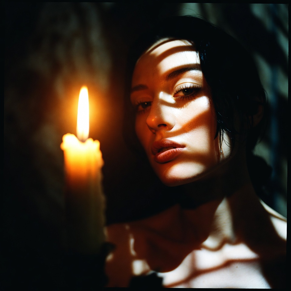 - Optional counter-tone (very subtle): cold steel-blue shadows for a modern neo-noir split without breaking candle motivation.