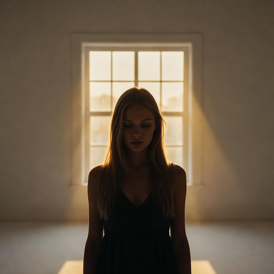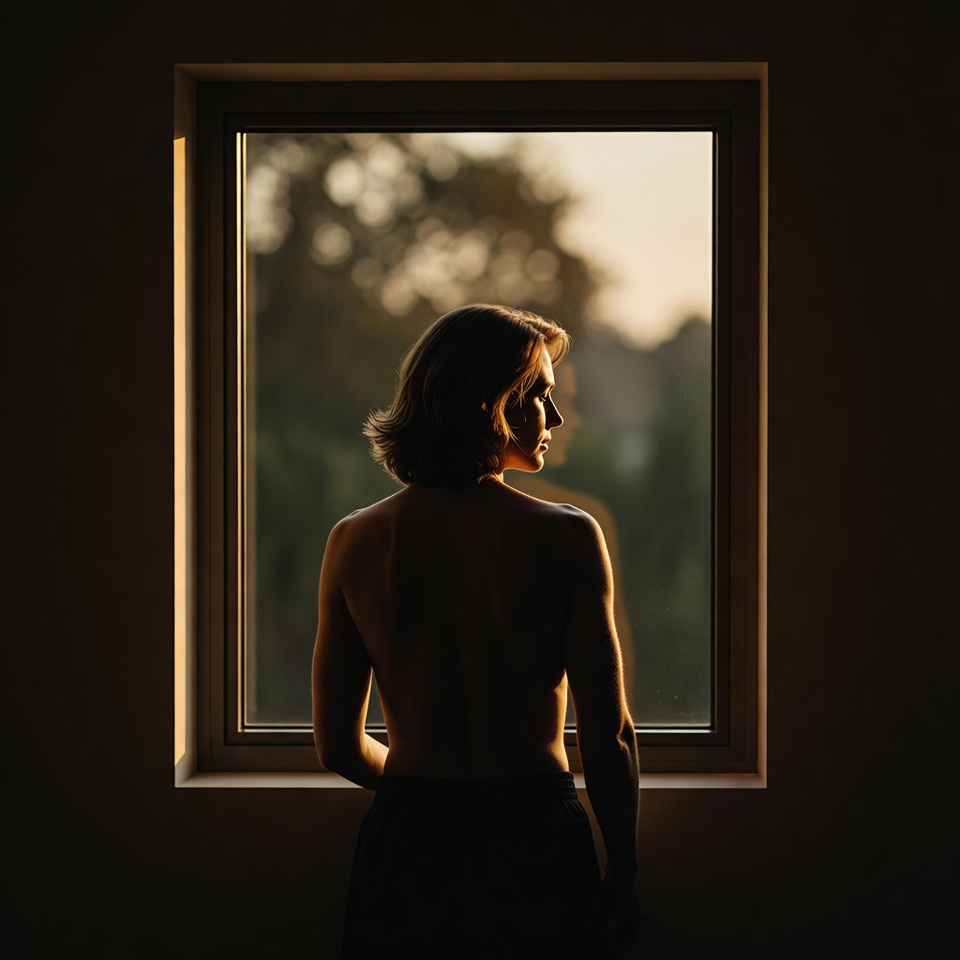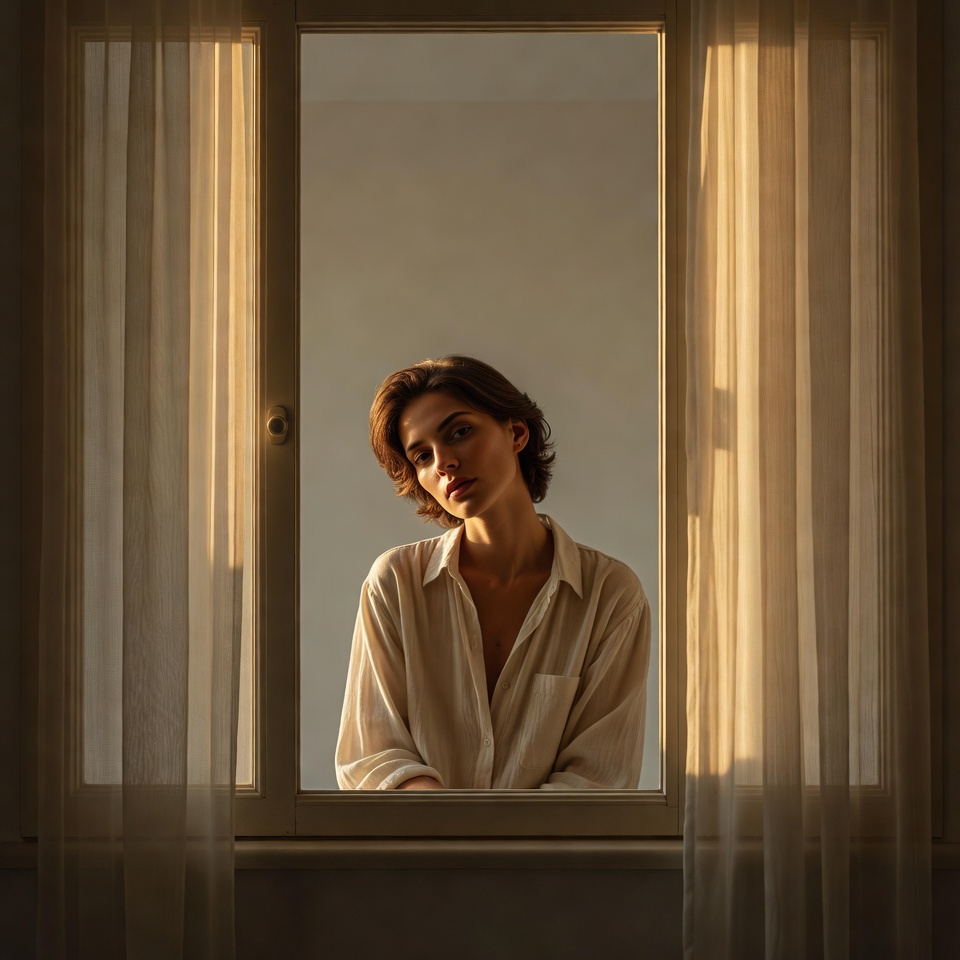 That’s the core of a Melancholic golden-hour portrait: the light is beautiful, but it doesn’t console. The backlight outlines the person like a memory present, yet unreachable. Add Frame within a Frame, and the image becomes observational, almost private: the viewer feels like they’re seeing someone through a doorway, a window, or the gap between curtains at the exact moment they’re lost in thought.
