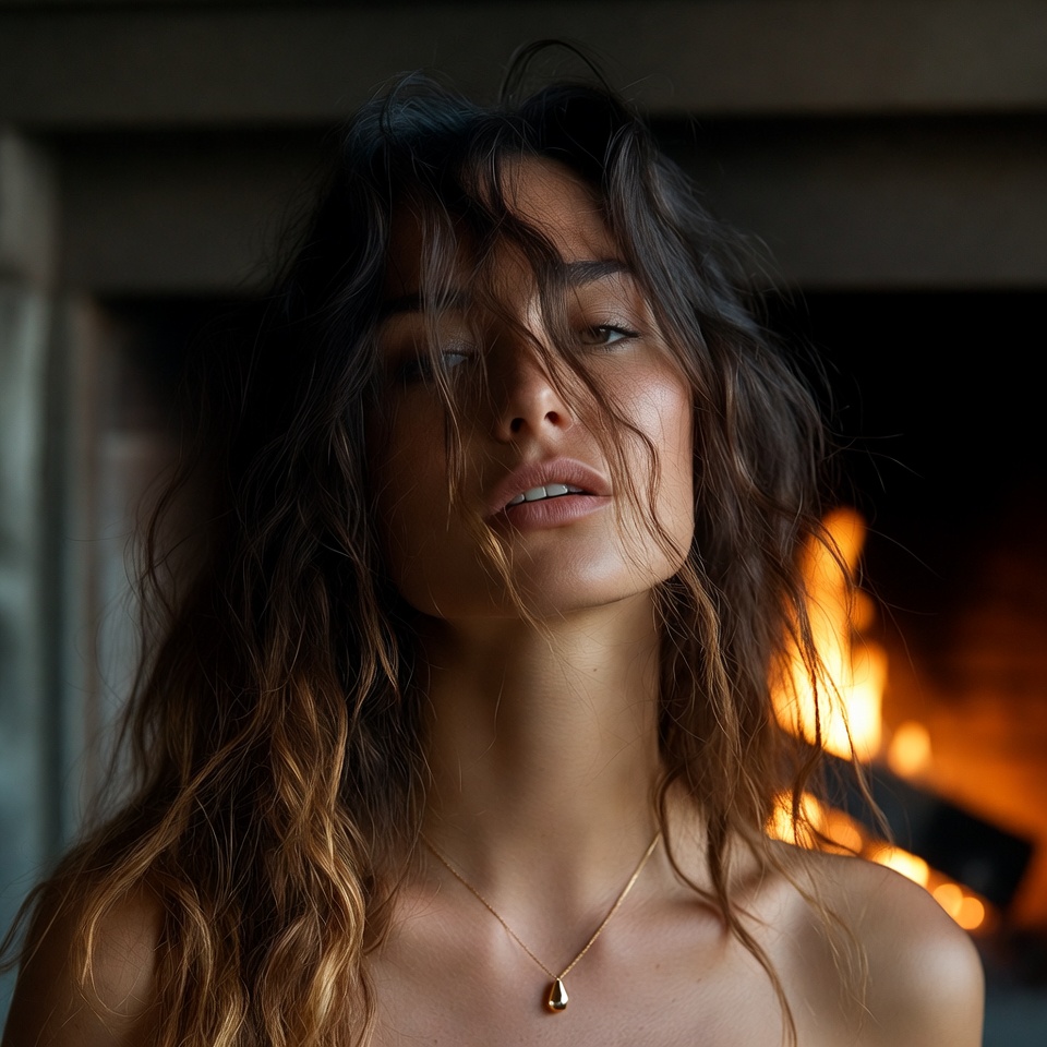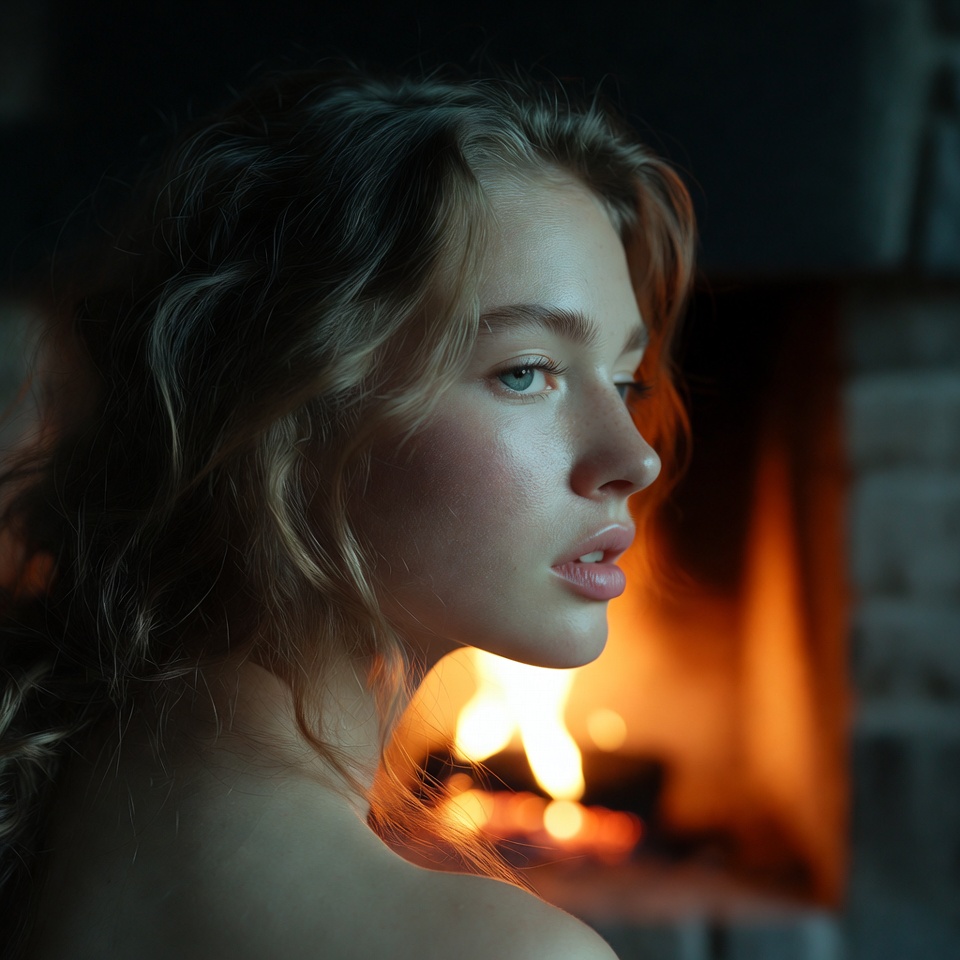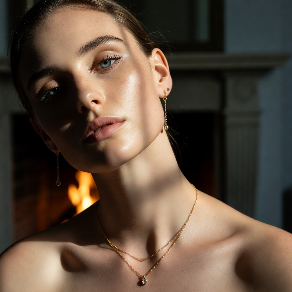Jewelry Editorial imagery is the art of controlled obsession: the face is a canvas, but the jewelry is the thesis. When your key light is Fireplace Glow, the scene becomes inherently cinematic warm, textured, and alive. Unlike sterile studio sources, firelight carries micro-variation: subtle flicker, shifting intensity, and a natural gradient that wraps the skin like heat rather than illumination.