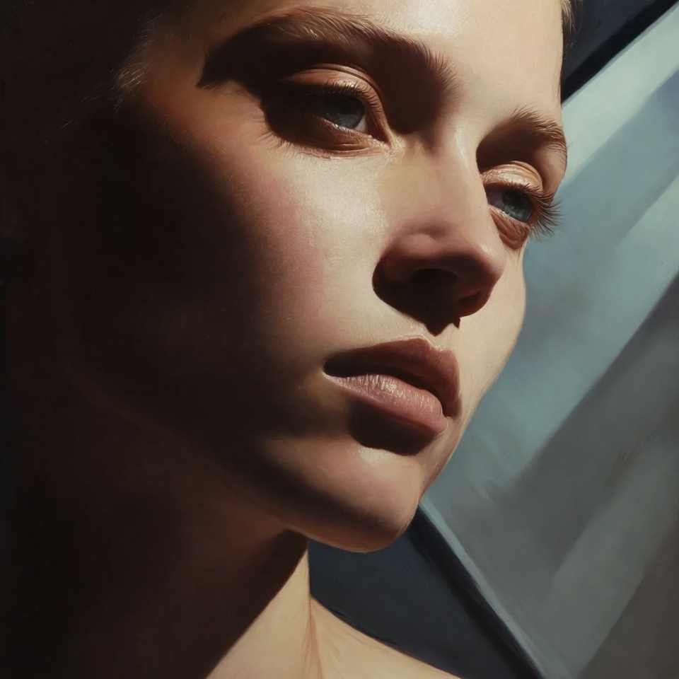 - Brushwork believability: Diffused light produces smooth gradients across cheeks, forehead, and fabric folds exactly the tonal behavior oil painters create through blending and glazing.