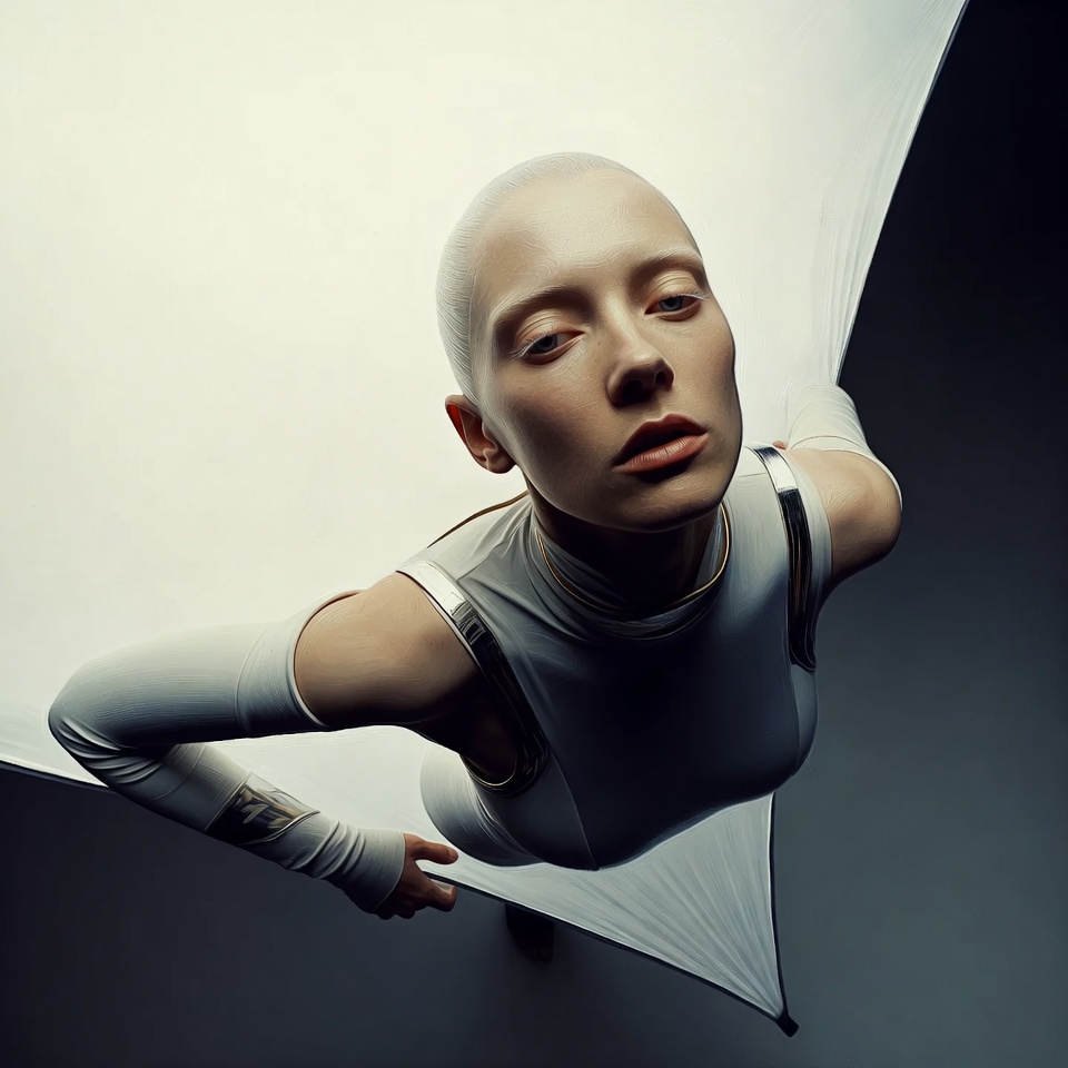 A: Futurism is created by design language (geometric wardrobe, metallic accents), reinforced by high-angle perspective and the engineered stability of triangle composition, while softbox diffusion preserves painterly realism through smooth tonal modeling rather than harsh modern highlights.