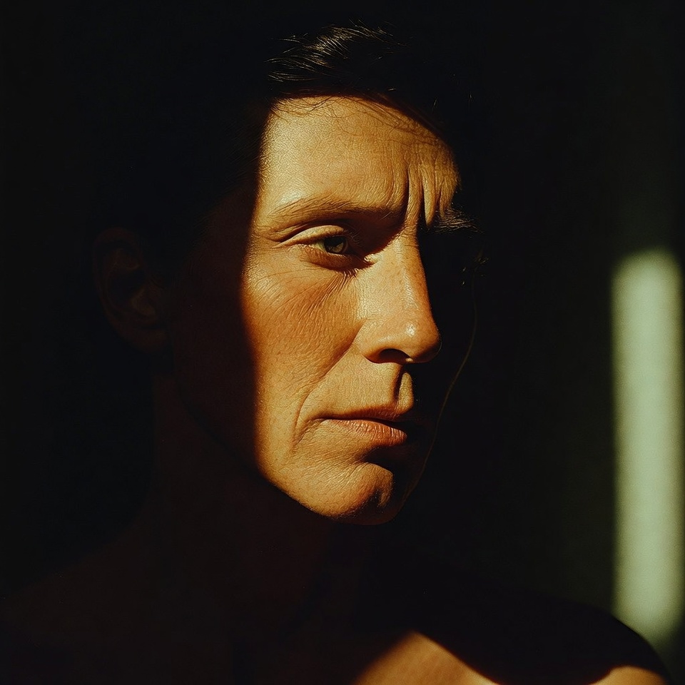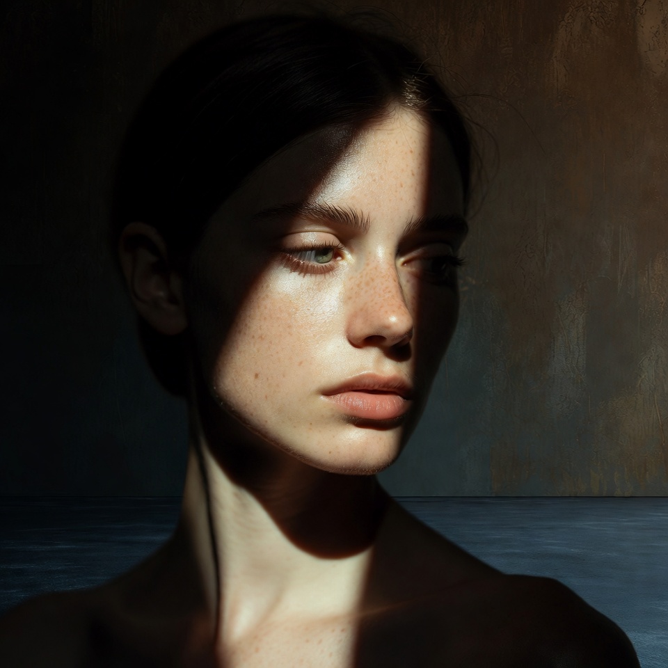 Refinement cue: If the image feels too severe, soften the shadow edge by implying a larger source (softbox feel) or adding subtle fill still Rembrandt, but gentler.