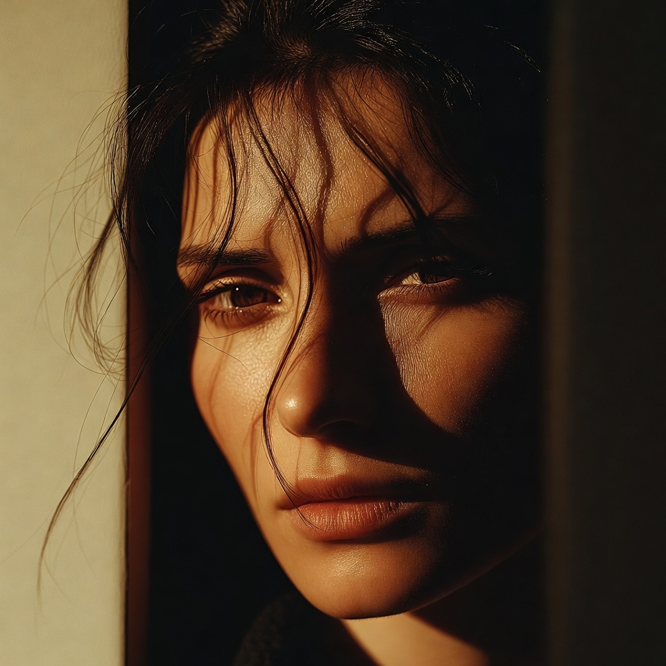 A: The nostalgia comes from classic Rembrandt shadow geometry, 85mm compression that isolates the subject, and negative space that implies absence, reinforced by warm highlight grading and gentle film-like texture.
