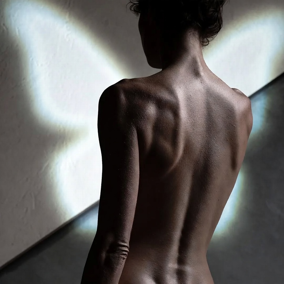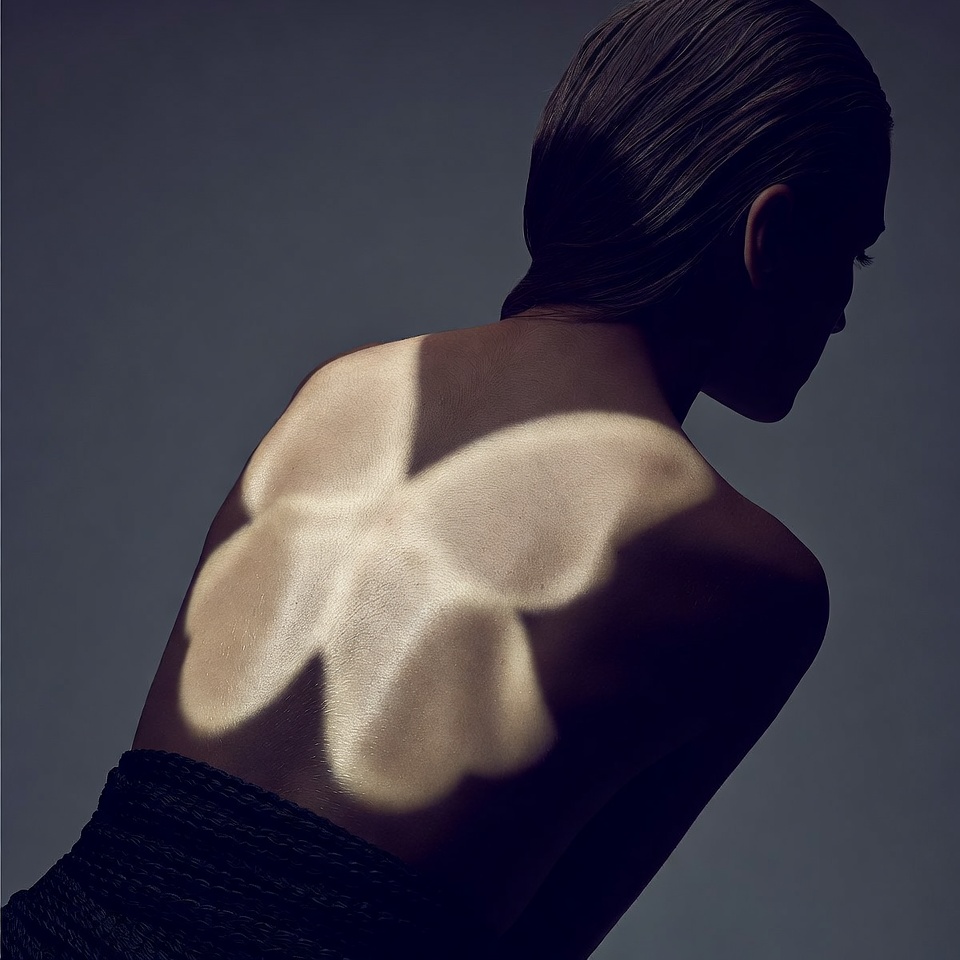 Editorial hack: Add a subtle rim or kicker (implied, not stated) via reflective set pieces; you keep the butterfly “beauty” intention while giving the back-view silhouette separation.