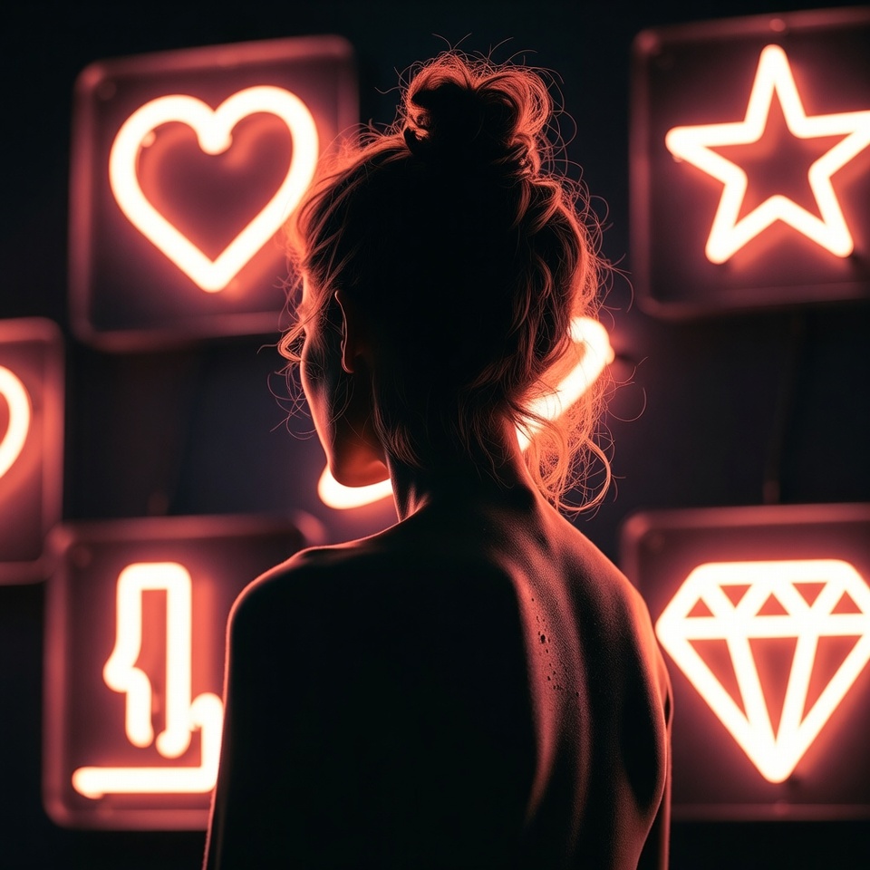 Q: What creates the Romantic feeling in a back-view neon portrait?