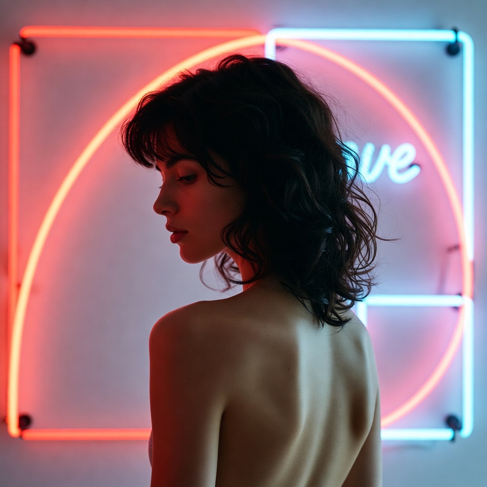 - Spiral attention path: the eye enters via negative space, rides the neon glow, then lands on the subject’s silhouette.