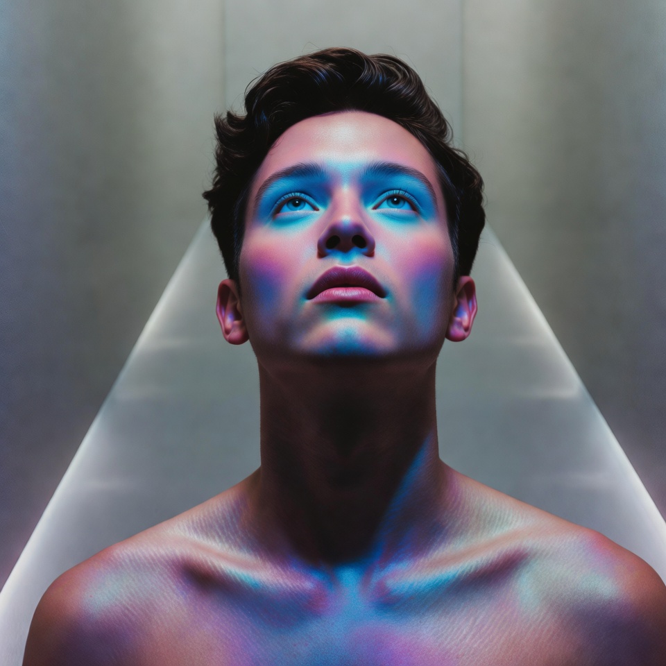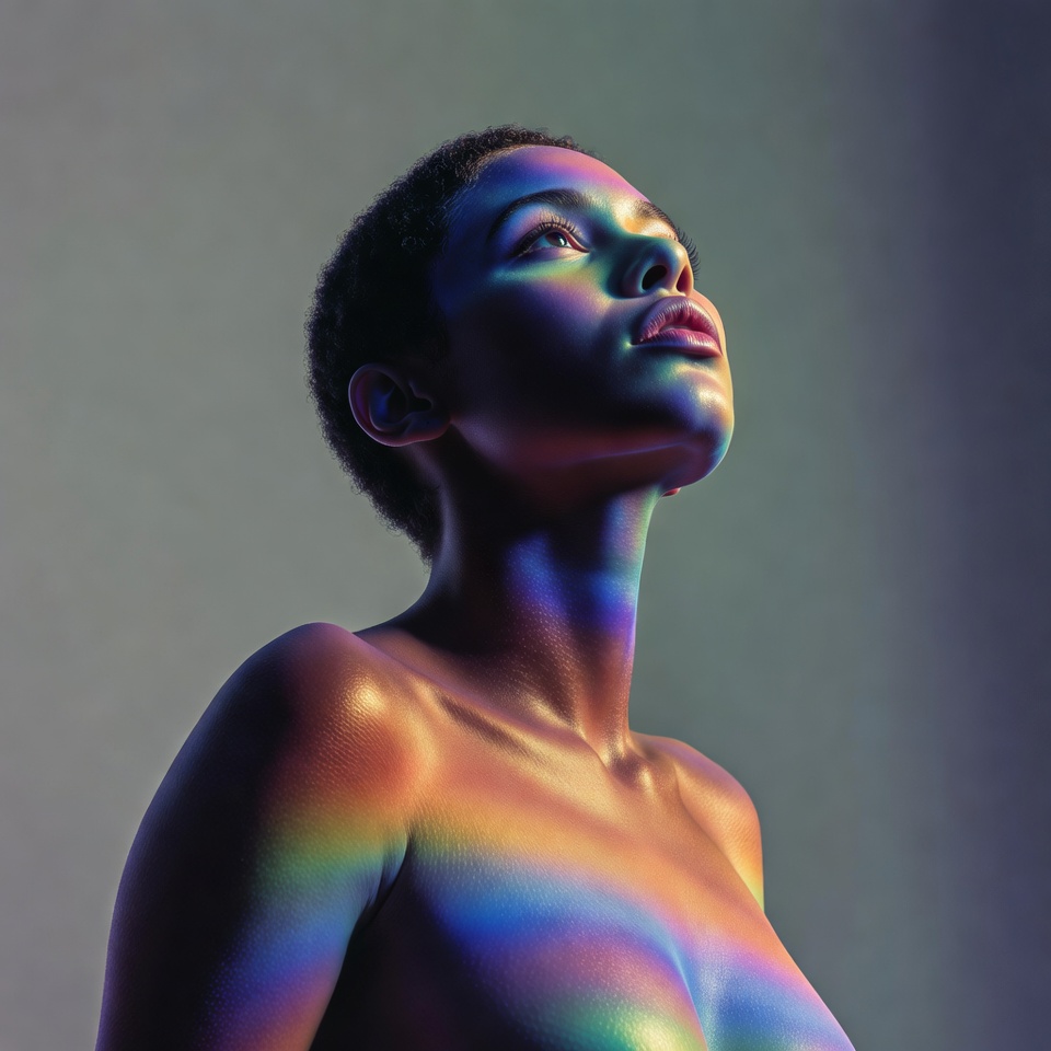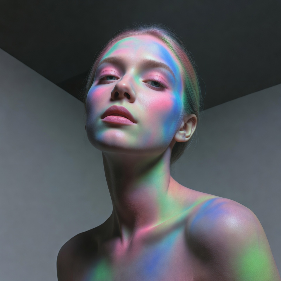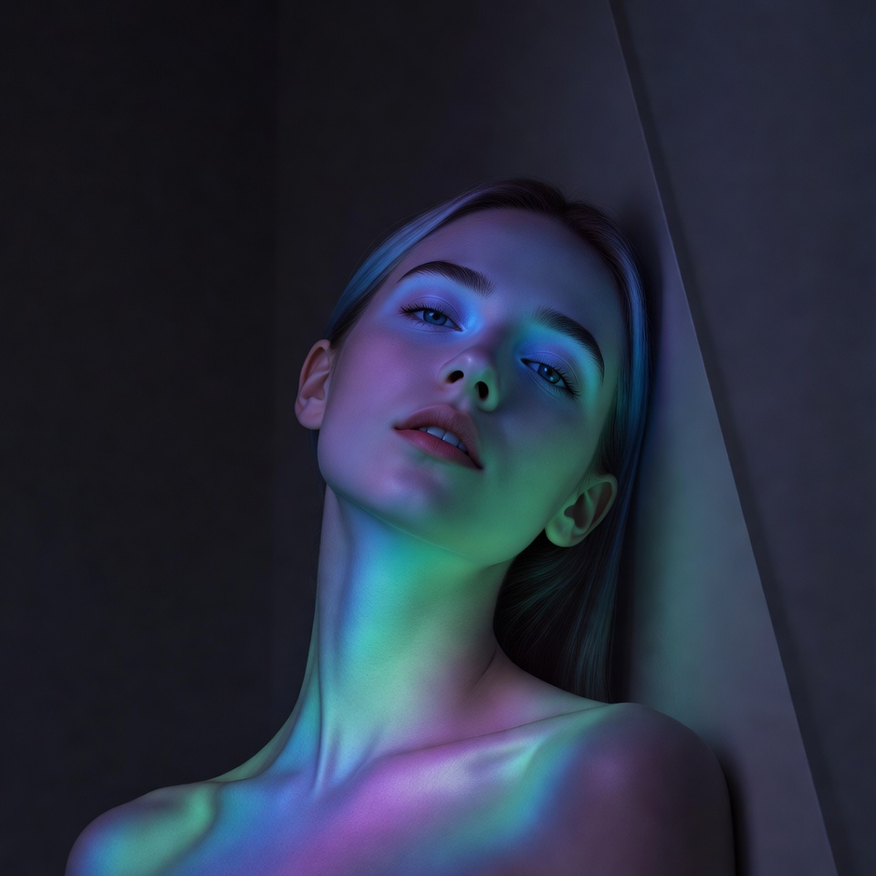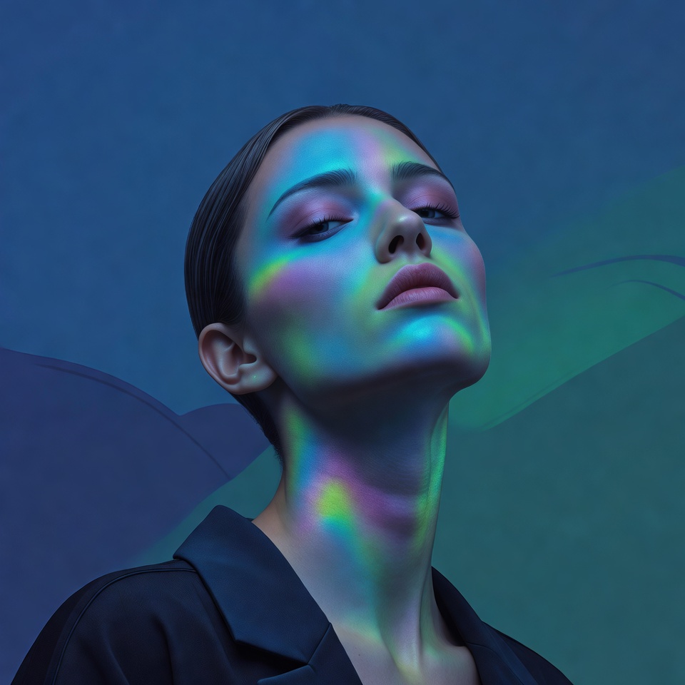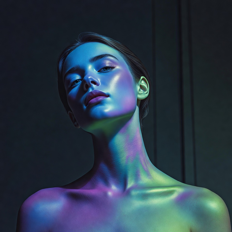 • Spectral edge definition: cyan/teal glows create clean subject separation (jawline, hairline, shoulders).