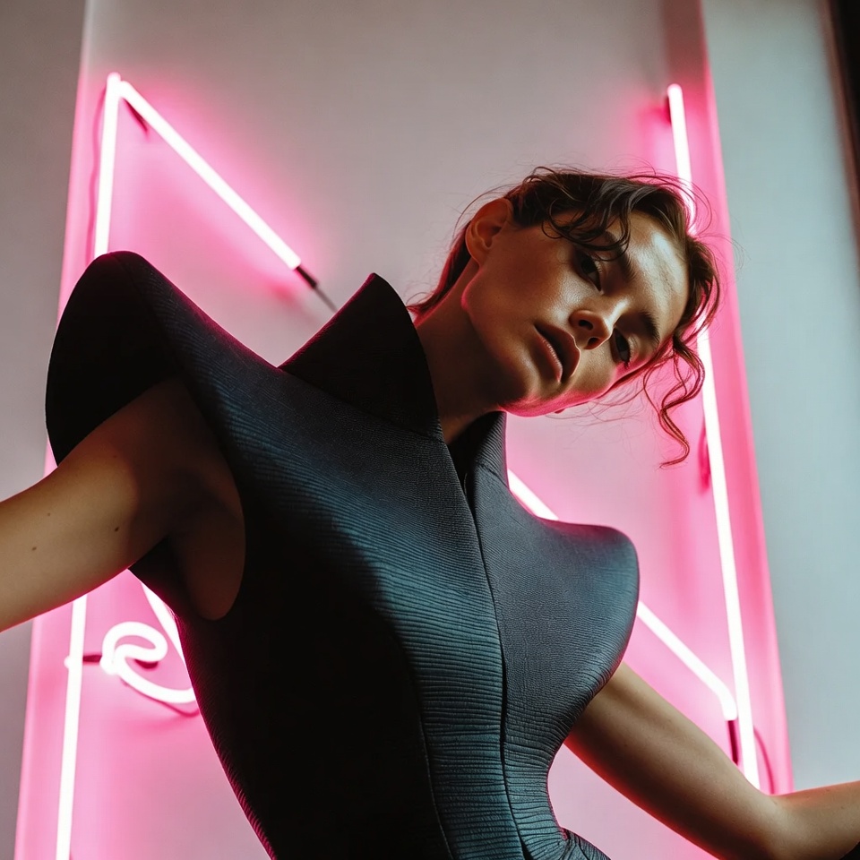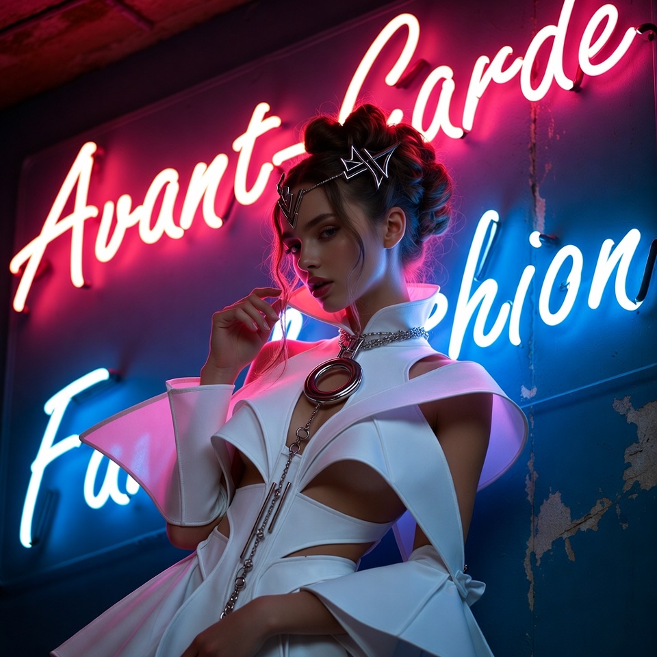 Avant-Garde Fashion thrives on controlled disruption silhouettes that challenge anatomy, styling that feels like sculpture, and images that look designed rather than merely captured. When the illumination is Neon Signs, the portrait inherits an urban electricity: saturated hues, luminous edge spill, and reflective highlights that turn textiles into liquid color.