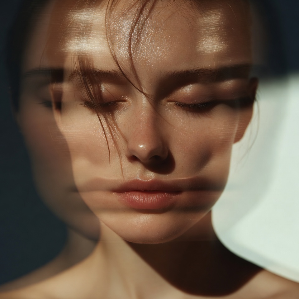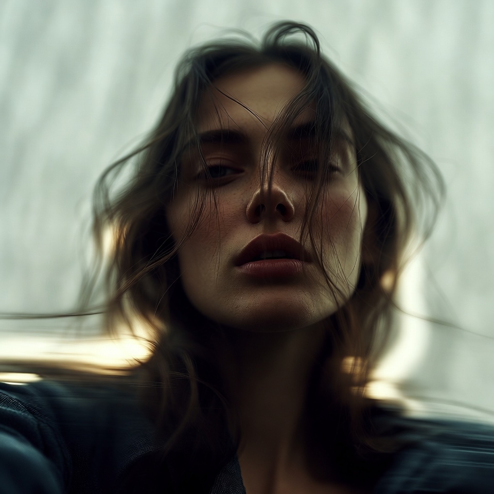A Selfie Angle brings uncomfortable intimacy close distance, slight perspective tilt, and the sense of a private moment captured without a crew. Then Center Symmetrical composition imposes order on the chaos: the frame feels controlled, but the blur reveals instability underneath. That tension is exactly where melancholy lives.