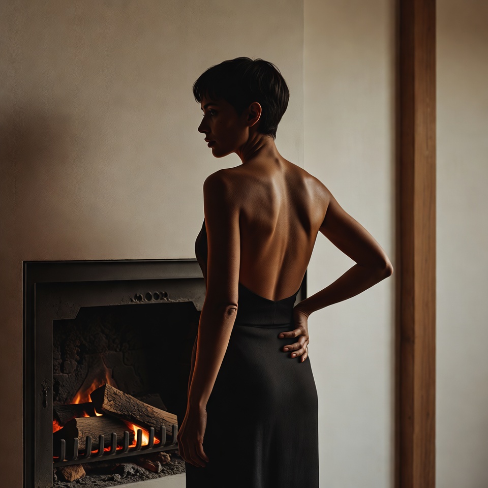 A: Energy comes from implied motion + asymmetry: back-view posture and movement cues do the emotional work, fireplace flicker adds life, and Rule of Thirds creates directional space that feels like the scene is unfolding.