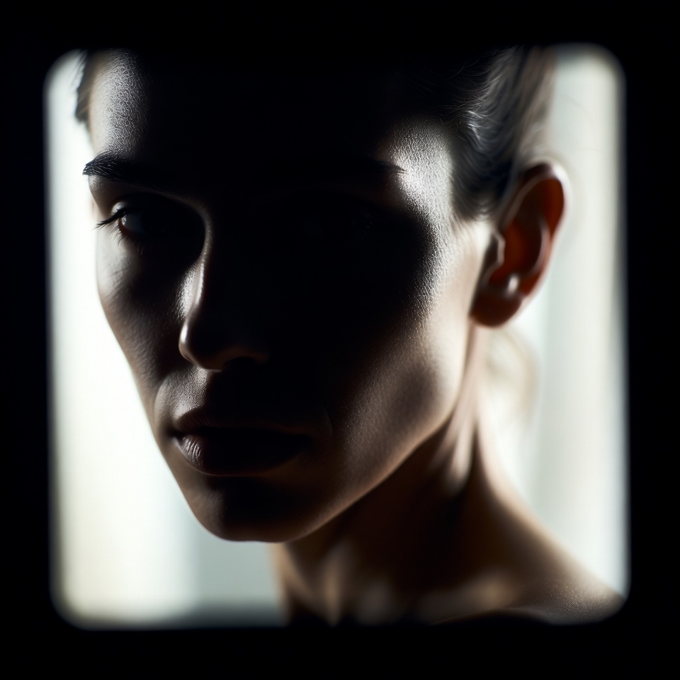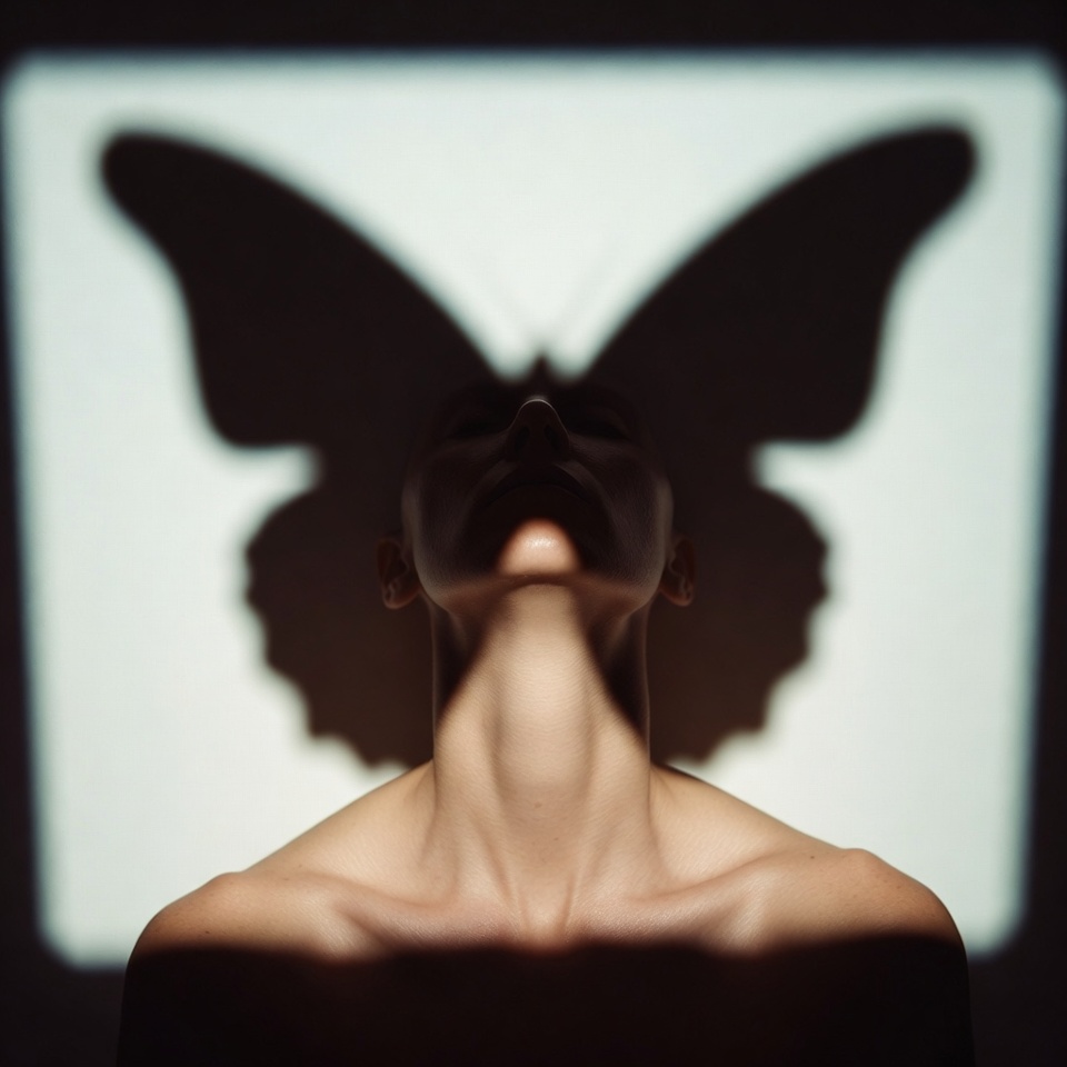 Butterfly Lighting places the key light high and centered, shaping the face with symmetrical falloff and a signature shadow under the nose (the “butterfly”). In a conventional beauty portrait, it flatters. In a silhouette, you’re repurposing it: the high key placement becomes an edge-making machine defining the brow ridge, nose bridge, lips, and shoulders as a crisp perimeter against a brighter field.