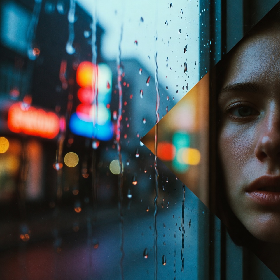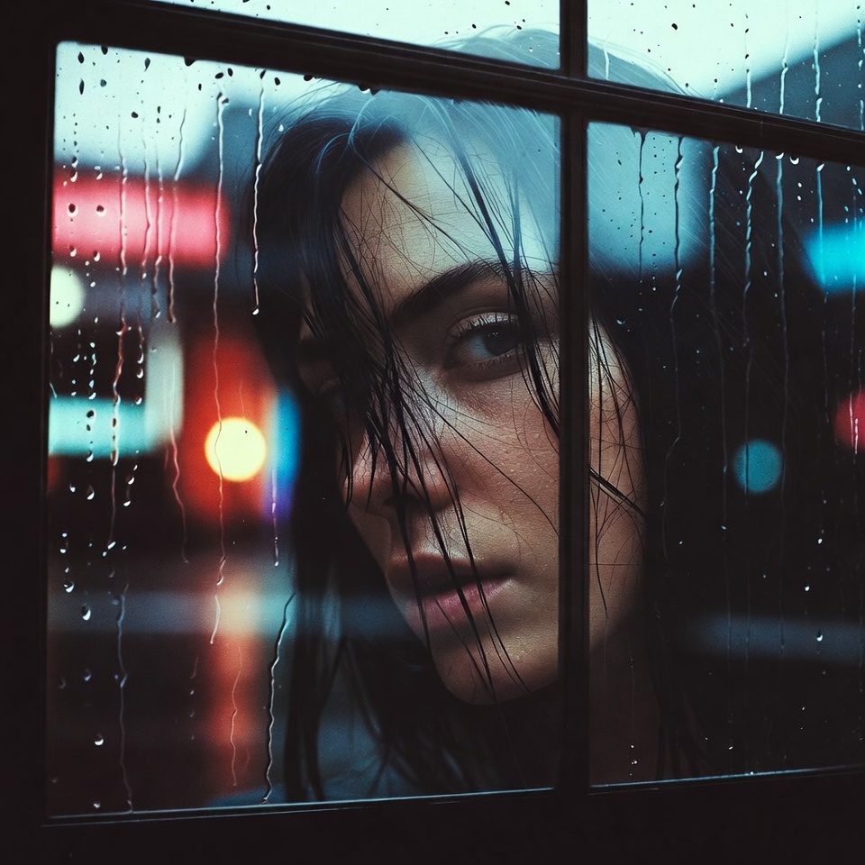 A Rainy Day Window portrait is a controlled interface between subject and city glass becomes a diffusion layer, raindrops become micro-lenses, and reflections become narrative. When the motivating light is Neon Signs, you get an urban spectral palette that behaves like liquid color across the window surface: magenta streaks, cyan spill, and fragmented highlights trapped in droplets.