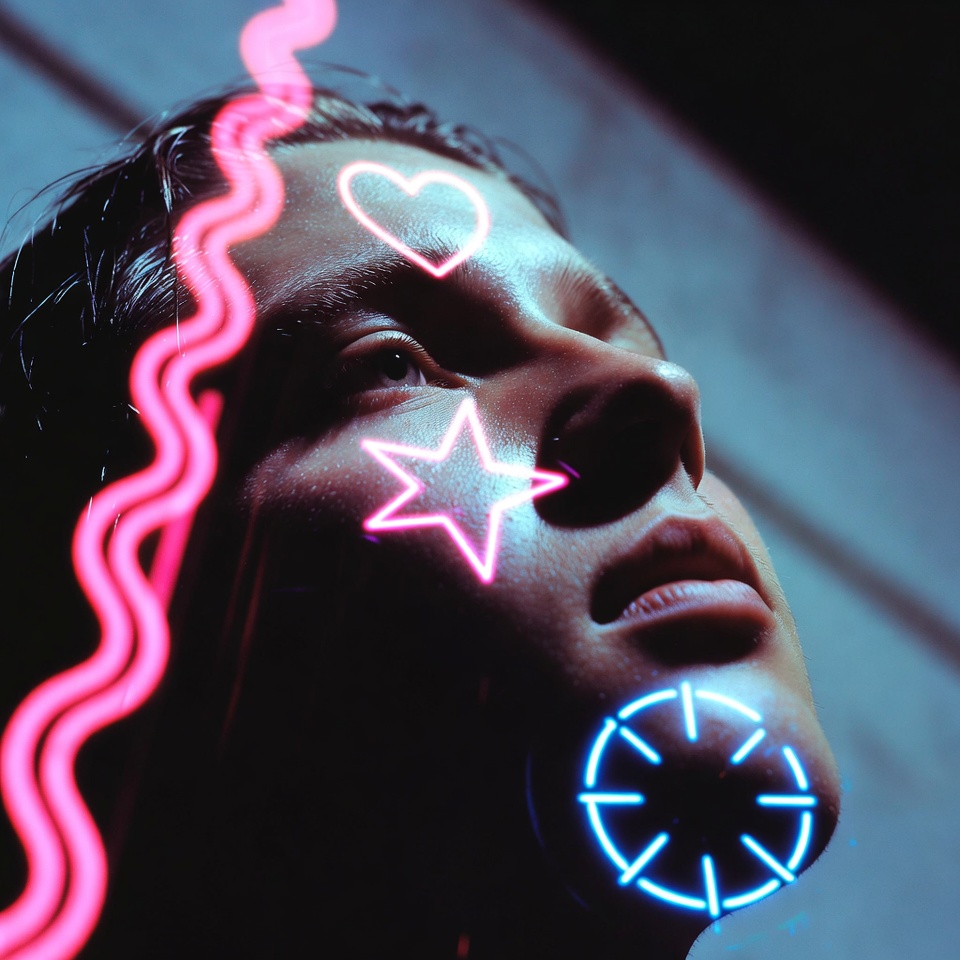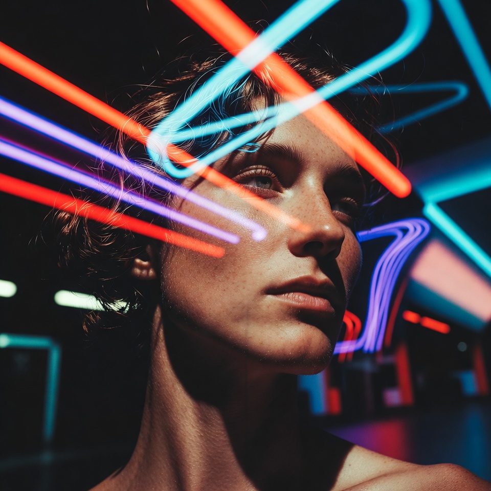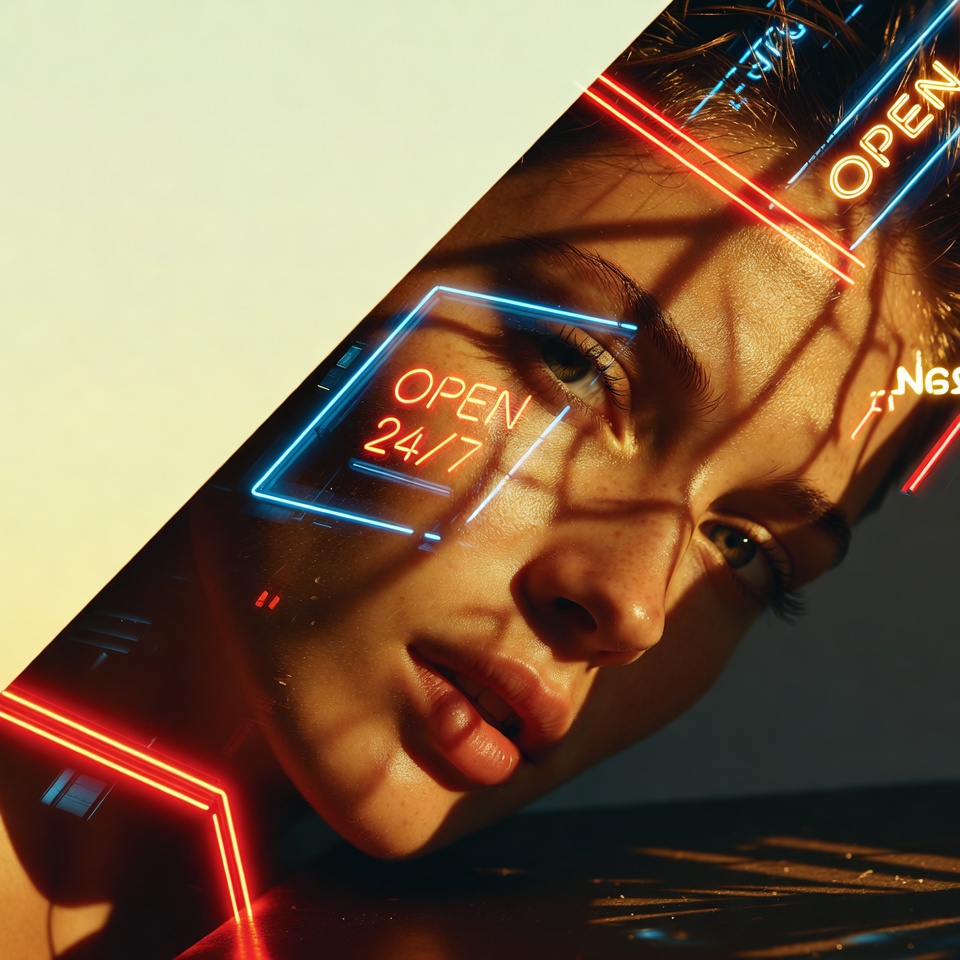 Control note: To avoid “radioactive skin,” push neon to behave like an overlay element (glow + bokeh + reflections) rather than a full-face wash.