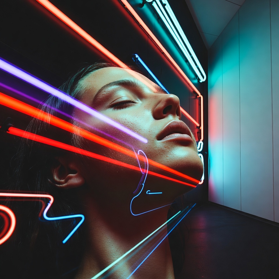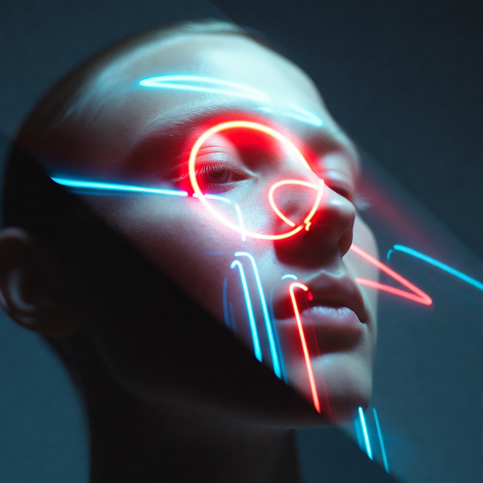 - Color-coded futurism: cyan/magenta/acid green read as synthetic and electronic, especially when layered into skin contours via double exposure.