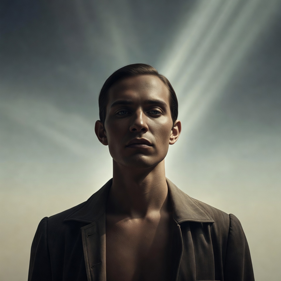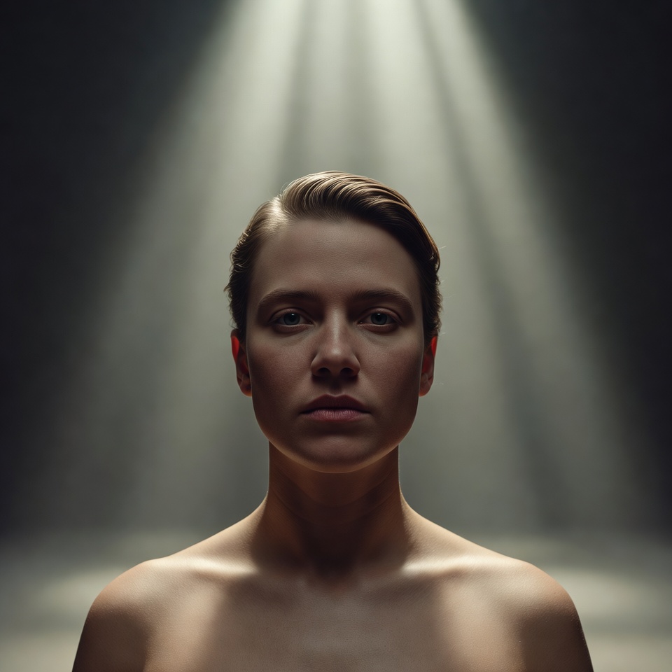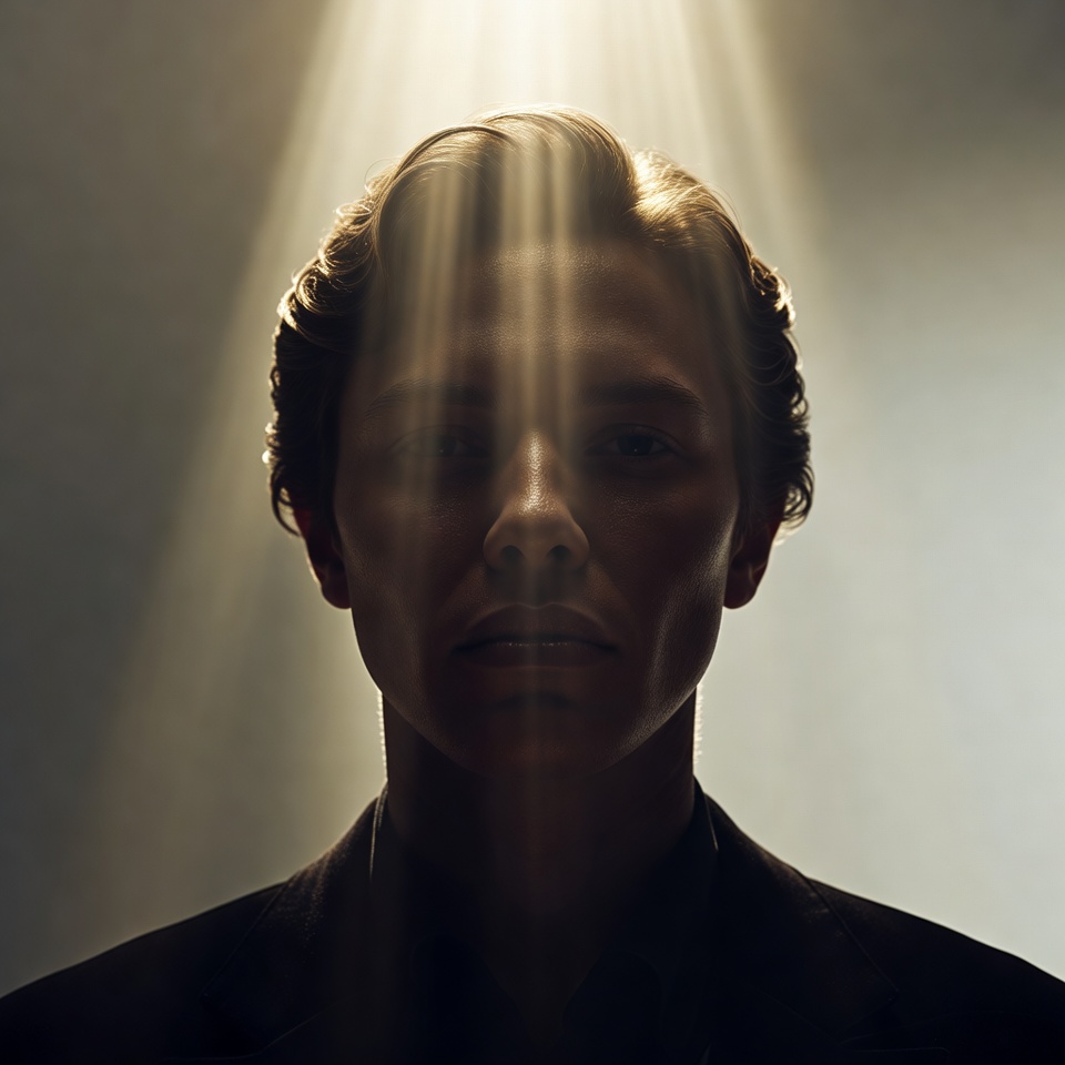 A: The mystery comes from controlled revelation: volumetric god rays spotlight space without fully explaining motive, wide-angle perspective adds tension and scale, and centered symmetry turns the subject into an unreadable icon.